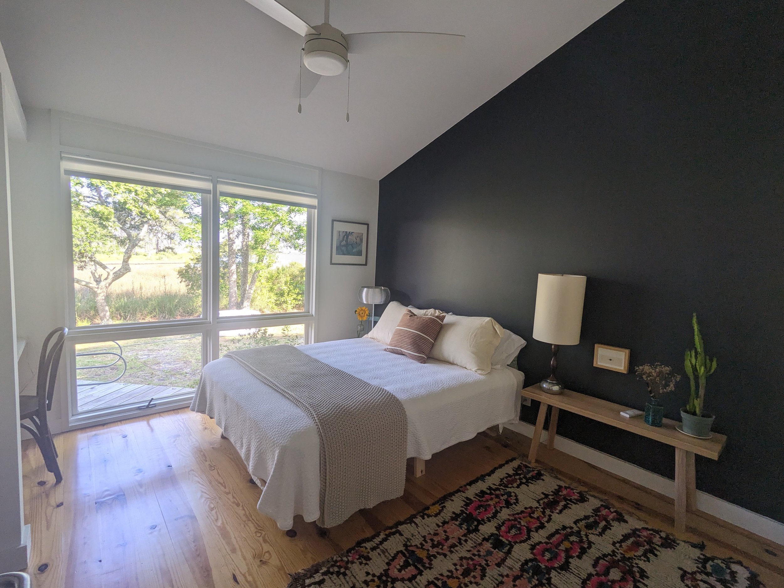 You’ll stay in a stunning mid-century modern home with custom-designed interior. This gem is located on a quiet 23 acres set on a private marshland with a cove that leads out to the Core Sound.